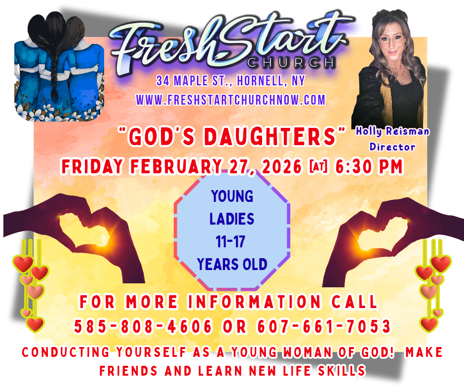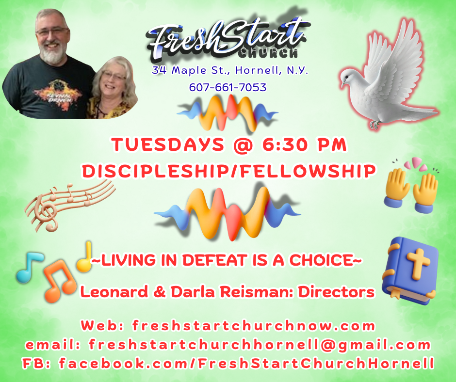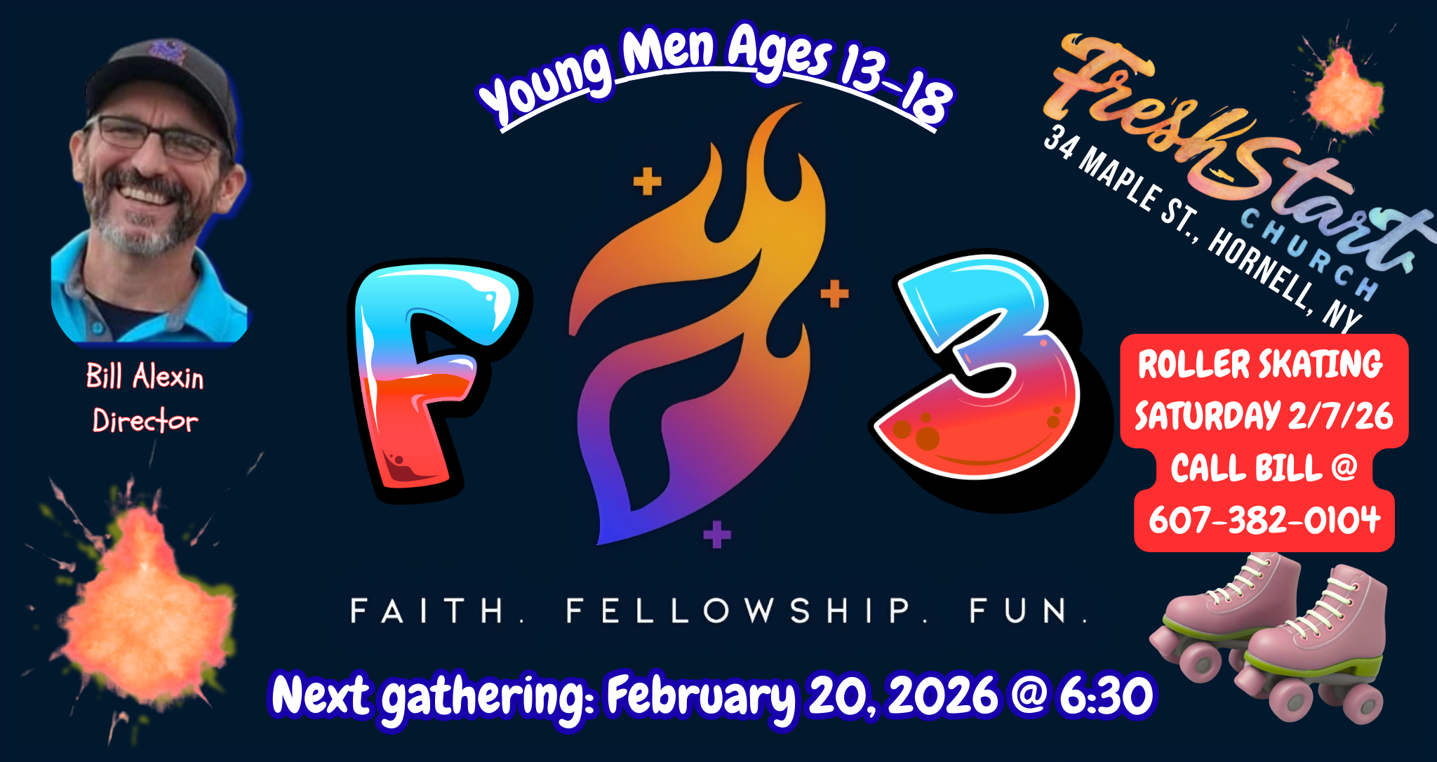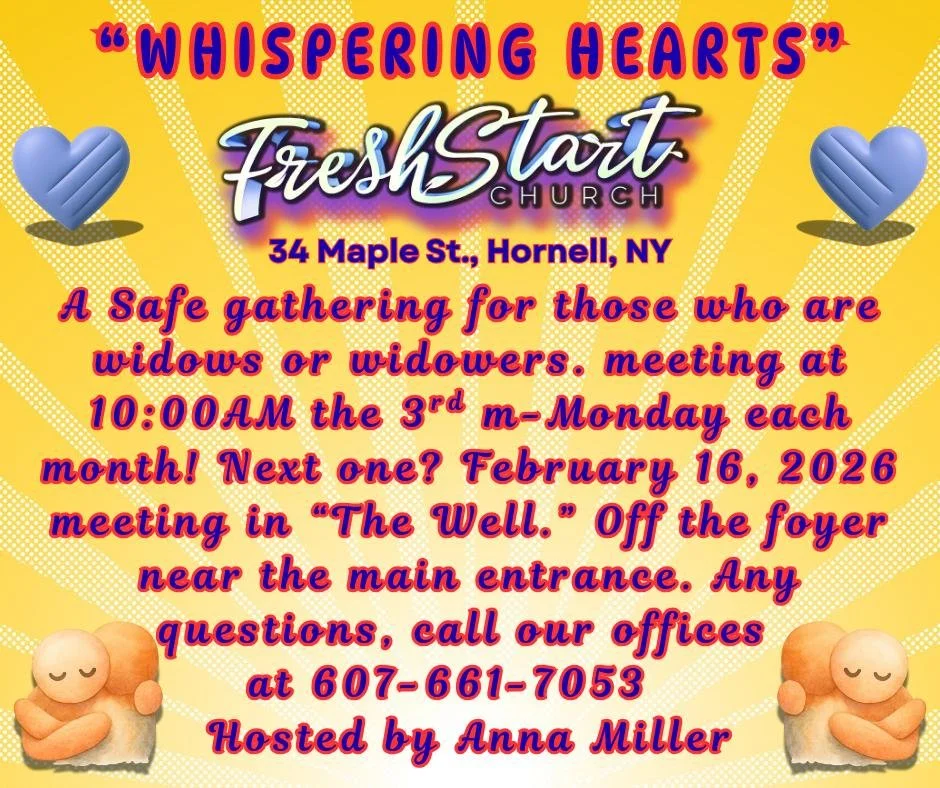 Meetings are Fridays at 6:30 PM (except for the 1st Friday) in one of the homes of one of our congregation. Refer to the website calendar for location & call the church office for more info. 607-661-7053.